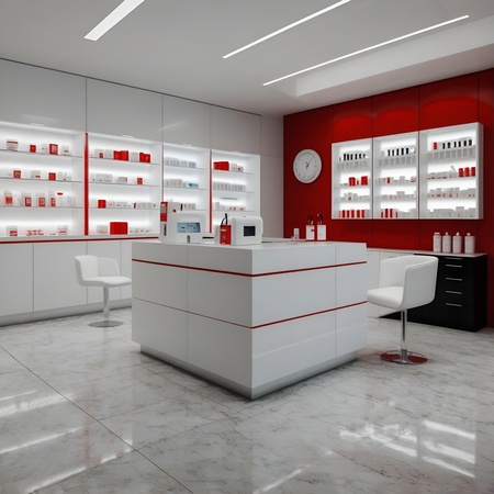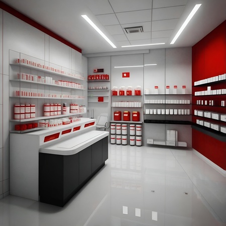 Промпты: 1. create an photo of a entry for the medical shop that recreates the medical and minimalistic aesthetic but with kind mood with white black and red colors in it. The entry whould be glass with posters and sign JUST IN CASE 2. create an environment photo of a simple modern interior design for the medical shop that recreates the medical and minimalistic aesthetic but with kind mood with white black and red colors in it. There should be cabinets with first aid kits, pills and thermoses