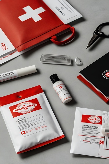 Промпт для обложки: create a mockup of printed materials like paper, pencils, envelopes and business cards with branding for brand of travel first aid kits. the design should be minimalistic and comedic. the colors are white, black and red.
