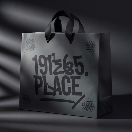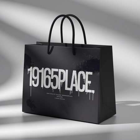 ideogram: mockup of a shopping bag for '19165PLACE, ' an exclusive, edgy online marketplace for rare and collectible items. the bag should be sleek and modern, with a dark color palette in shades of charcoal, black, and deep indigo. the brand’s graffiti-inspired logo is prominently displayed in a bold, minimalist style, with subtle textured accents to give it an underground, street-inspired look. the bag has sturdy black handles and a matte finish, exuding a sense of sophistication and mystery. soft shadows and lighting highlight the bag’s structure, making it feel like a high-end piece from an exclusive collector’s club