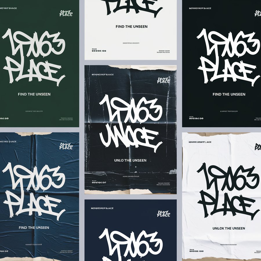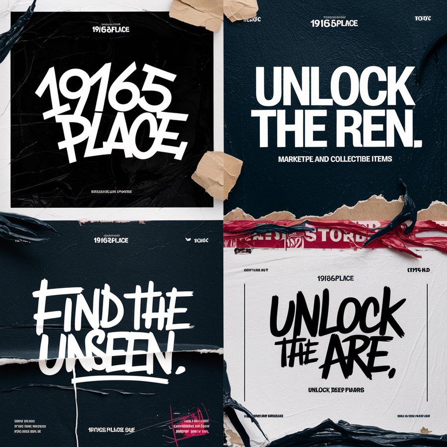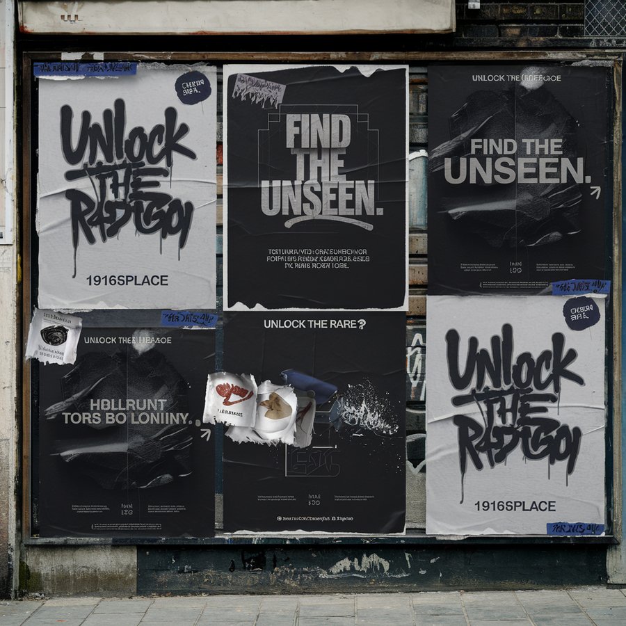 ideogram: a collection of advertising posters for the underground marketplace '19165PLACE'. each poster features the brand’s graffiti-style logo prominently. the posters have gritty textures, dark tones (charcoal, black, deep indigo), and minimalist layouts. the taglines «Find the Unseen» and «Unlock the Rare» are placed prominently. the posters have torn paper edges, spray-paint effects, and subtle street-style graphics. the overall design is raw and high-fashion, with an urban, rebellious touch