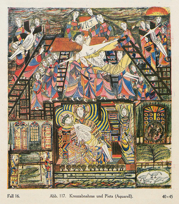 слева — Питер Муг, «Снятие с креста и пиета»; справа — Август Клоц, «Игриво-декоративная работа», иллюстрации из книги Ханса Принцхорна «Художественное творчество душевнобольных», 1922