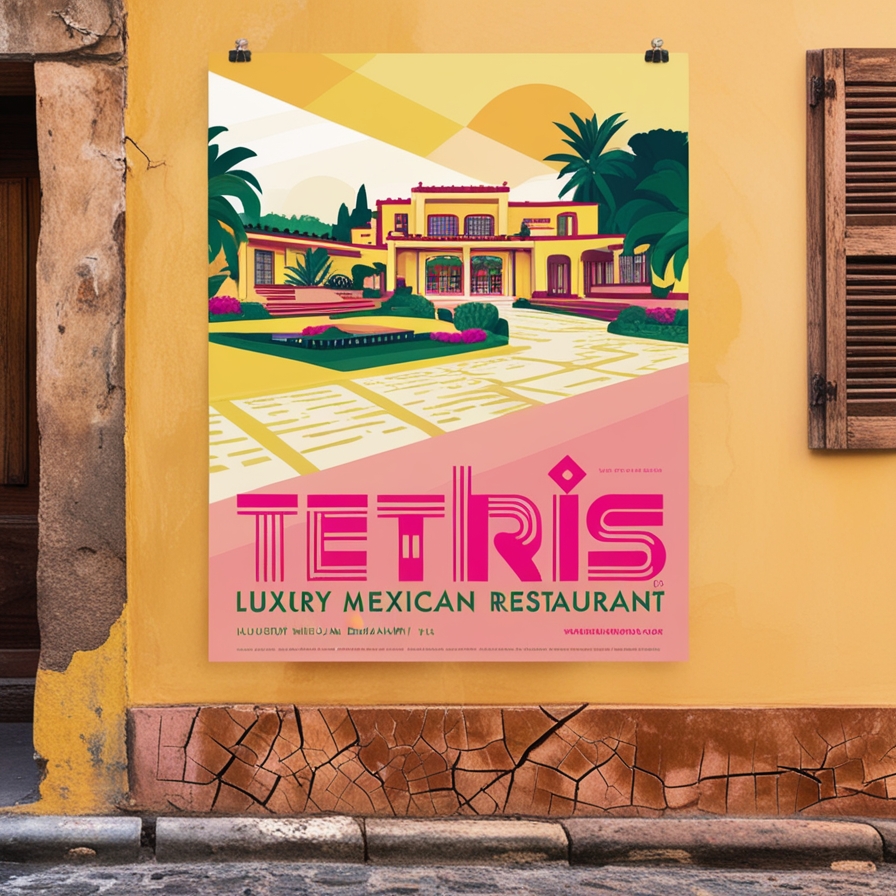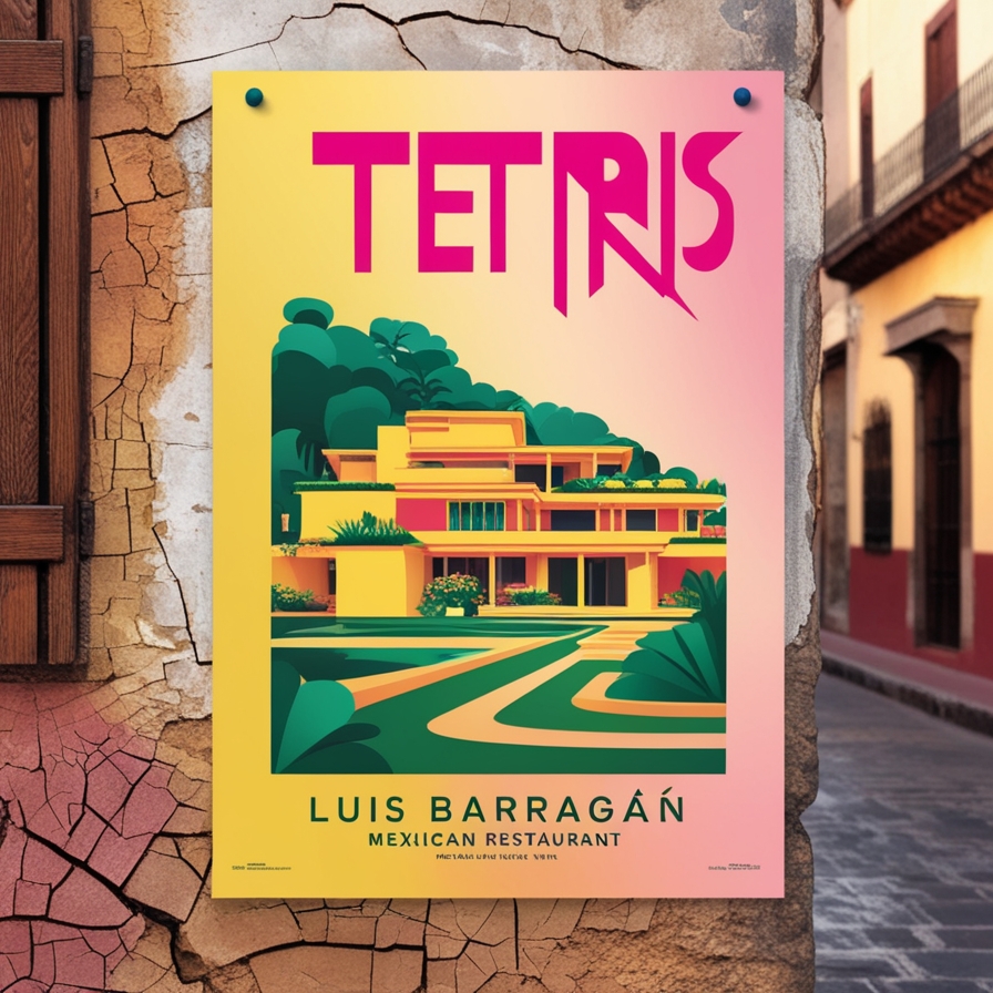 create a poster in yellow and pink colors for a luxury mexican restaurant called «Tetris». It should include a drawing of Luis baragan villa. It should be hanging on the street