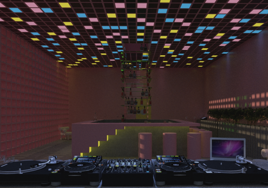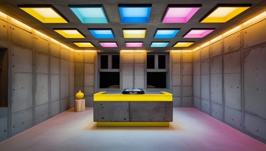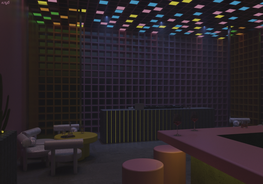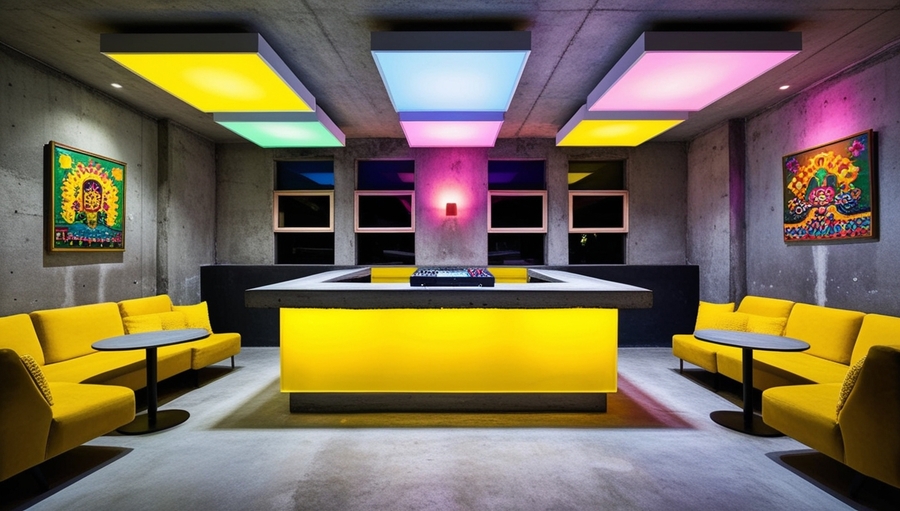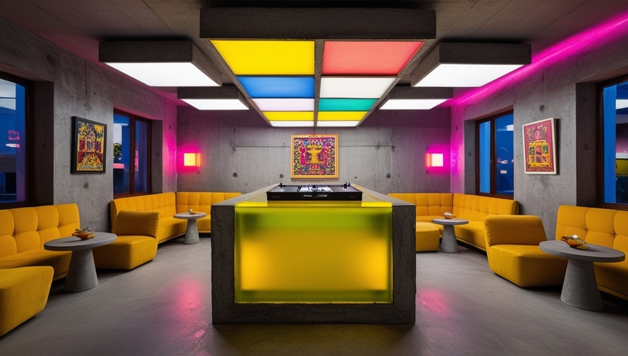 Create a night club in colors of Luis Barragán. Make walls and floor from grey old concrete and colorful light boxes on the ceiling. Make the yellow bar made from yellow glass and concrete in the center of the room. Place DJ table in the corner of the room. It should be night outside and very small square windows. Add some soft yellow and pink lighting. Make it 600 square meters big. Add some yellow soft chairs and sofa and put Mexican painting on the walls
