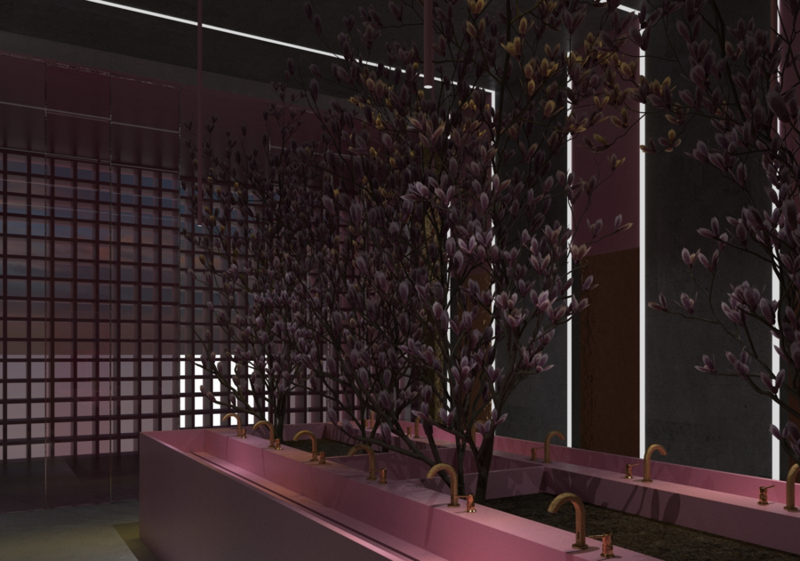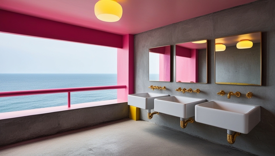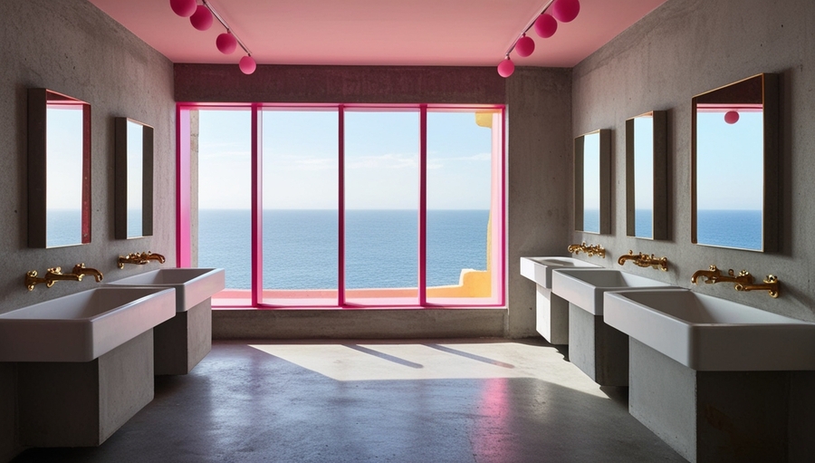 Imagine interior of a public toilet in colors of Luis Barragán with one big panoramic window overlooking the sea and huge square sink with gold faucets for 5 people. Make walls and floor from grey old concrete and pink lights hanging from ceilling. Add pink and yellow soft lighting