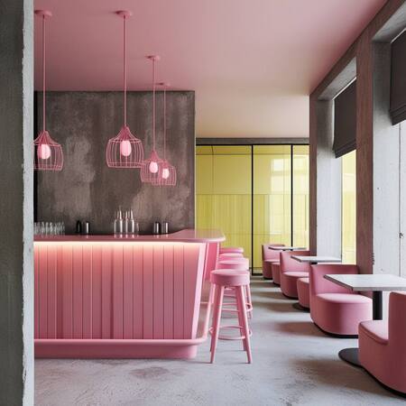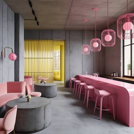 Create lounge bar of restaurant in colors of Luis Barragán. Make walls and floor from grey old concrete and pink lights hanging from ceilling. Make pink bar with cage alike lights on the wall. Add some soft yellow glass wall inside. Make it in render quality stylistics