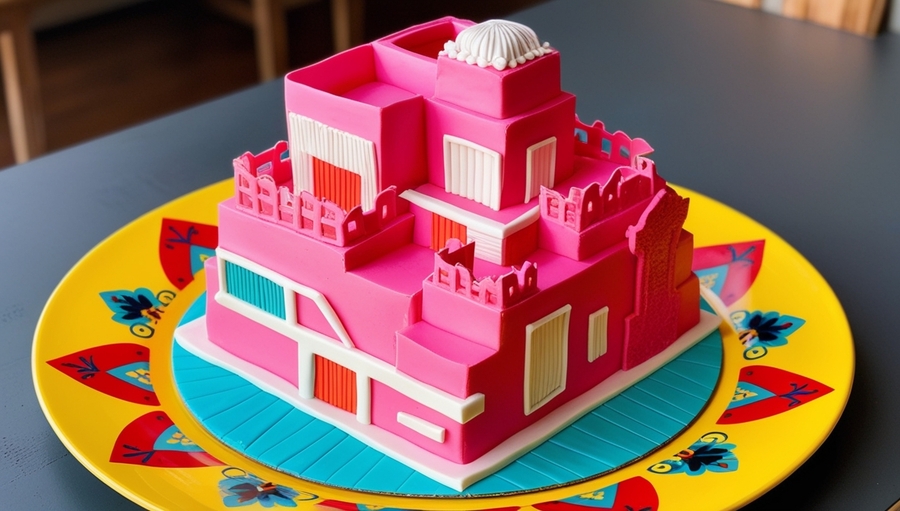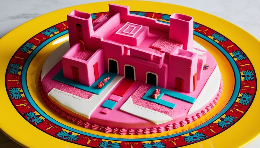 Create a pink cake in the shape of Luis Barragán villa in a large yellow plate with Mexican pattern