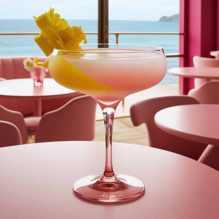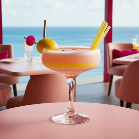 Create a cocktail in a glass with soft, ombre-inspired pink hues that gradate to whites and yellows. The drink’s wispy, velvety texture should be evident in the rendering Place the cocktail on a rich, dark wood table in a luxurious, minimalist restaurant, surrounded by subtle hints of lush greenery and creamy stucco walls that evoke the elegant, modernist aesthetic of Luis Barragán. The ambiance should exude refinement and sophistication, with soft, warm lighting that accentuates the cocktail’s vibrant colours and the table’s polished finish