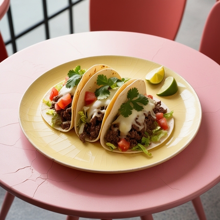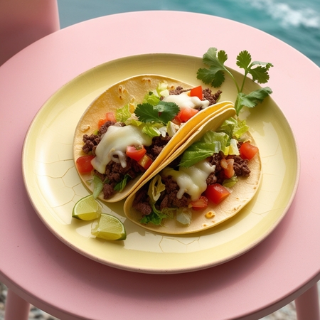 Create a vibrant taco dish, with juicy ground beef, crunchy lettuce, diced tomatoes, and melted cheese, arranged artfully on a soft yellow ceramic plate with subtle cracks and slight imperfections, placed in the center of a pink Luis Brragon style table with a smooth, hadorned with a few scattered lime wedges and a sprig of fresh cilantro, set against the sea view, the style and aesthetic of Luis Barragan’s architecture