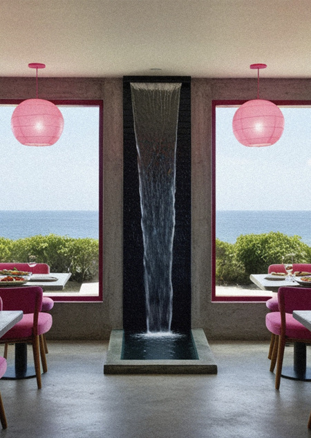 magine interior of a mexican restaurant in colors of Luis Barragán with one big panoramic window overlooking the sea and waterfall in the middle of the dining room. Make walls and floor from grey old concrete and pink lights hanging from ceilling. put some Mexican food on the table