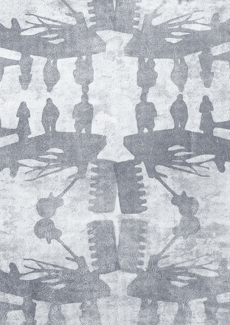 Собранные из силуэтов лиц, зданий и предметов, они складываются в орнамент, где конкретность явления теряется за частотой его возобновления.
