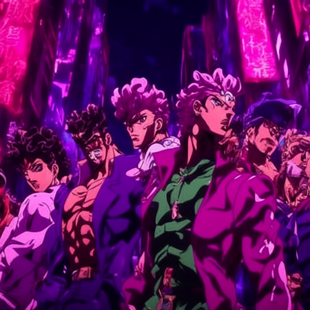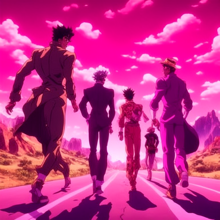 Аниме «JoJo’s Bizarre Adventure» — это не просто серия, а целая вселенная, обладающая неповторимой эстетикой и энергией, которая сразу же запоминается. Уникальный визуальный стиль, эксцентричные персонажи и динамичные сцены сделали его настоящей иконой. Моя задача была создать кастомную модель на базе Stable Diffusion, которая могла бы генерировать новые картинки в стиле JoJo. Для этого я собрал более 200 скриншотов из аниме и использовал метод Dreambooth LoRA, чтобы обучить модель именно на этом визуальном материале.