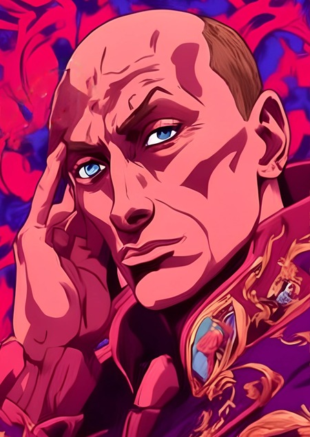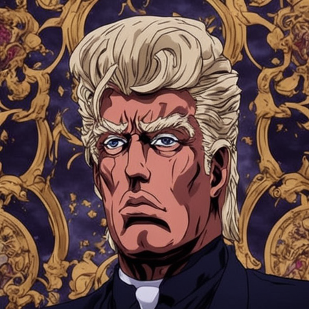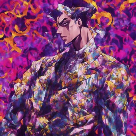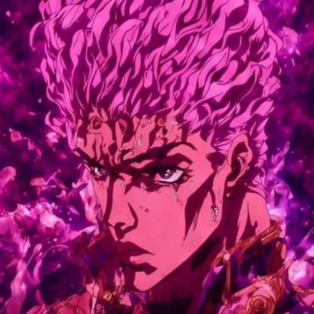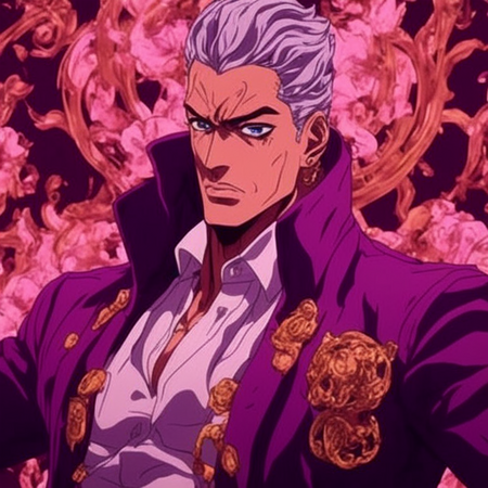 prompt = A stylish portrait of character inspired by JoJo’s Bizarre Adventure, showcasing extravagant fashion, dramatic lighting, and an expressive, confident gaze, with intricate ornamental details.