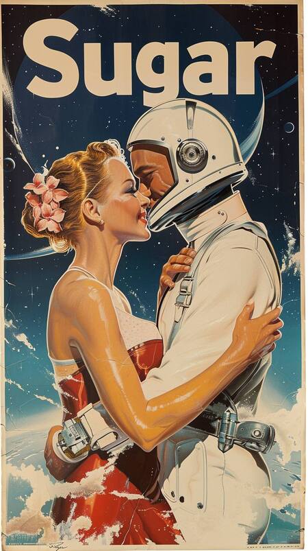 poster for a holiday agency depicting happy newlyweds, in the style of science fiction films, with the word «Sugar» --aspect 9:16 --v 6.0 --style raw