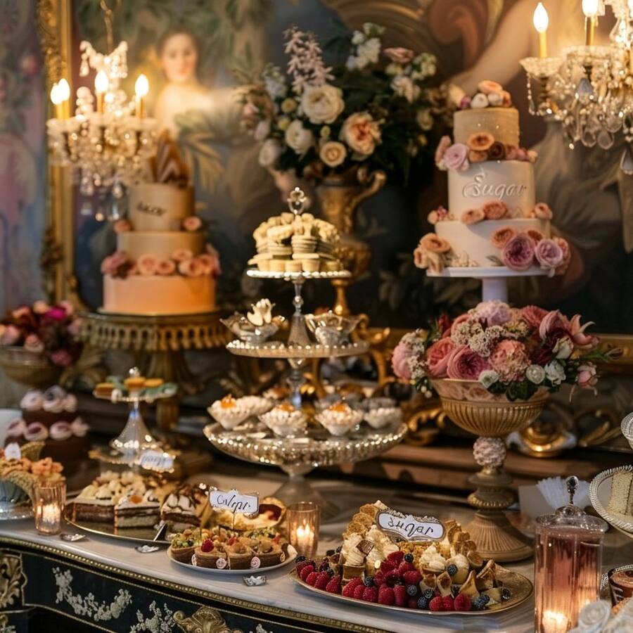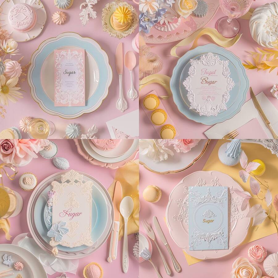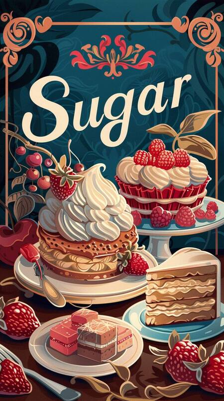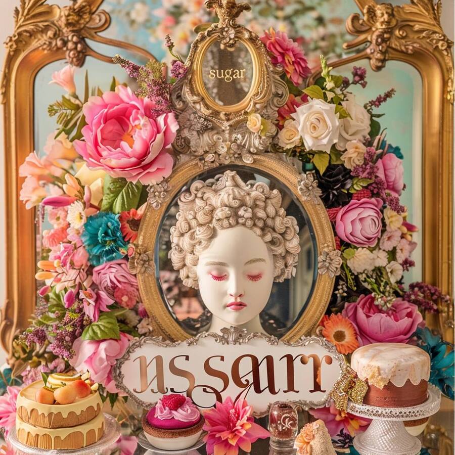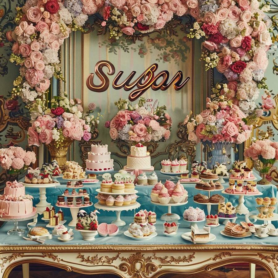 poster for a holiday agency depicting cakes and sweets, in the Rococo style, with the word «Sugar» --aspect 9:16 --v 6.0 --style raw