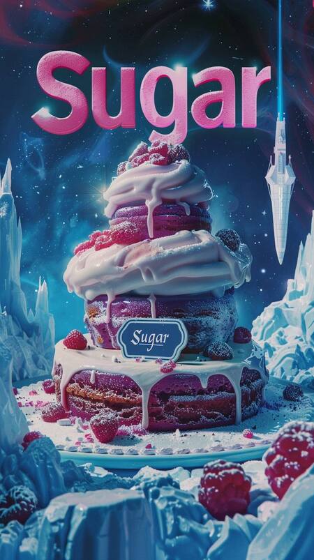 poster for a holiday agency with a picture of a cake with a lot of cream on it, in the style of science fiction films, with the word «Sugar» --aspect 9:16 --v 6.0