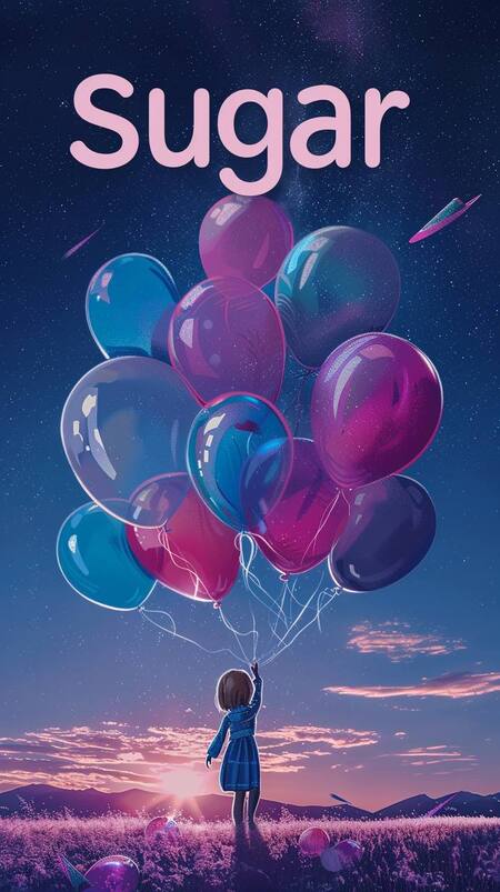 poster for a holiday agency with the image of a five-year-old girl with balloons on her birthday, in the style of science fiction films, with the word «Sugar» --aspect 9:16 --v 6.0 --style raw