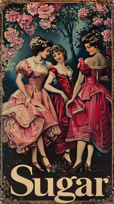 poster for a holiday agency depicting girls in full skirts, in the Baroque style, with the word «Sugar» --aspect 9:16 --v 6.0 --style raw