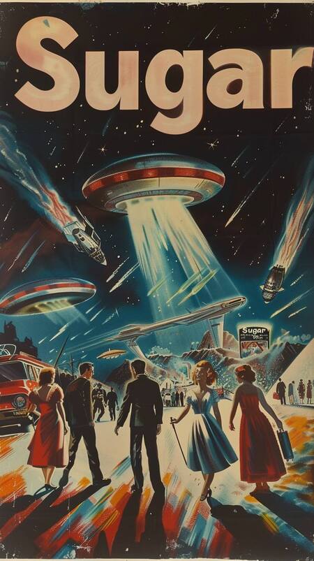 poster for a holiday agency depicting sugar and people enjoying life, in the style of science fiction films, with the word «Sugar» --aspect 9:16 --v 6.0 --style raw