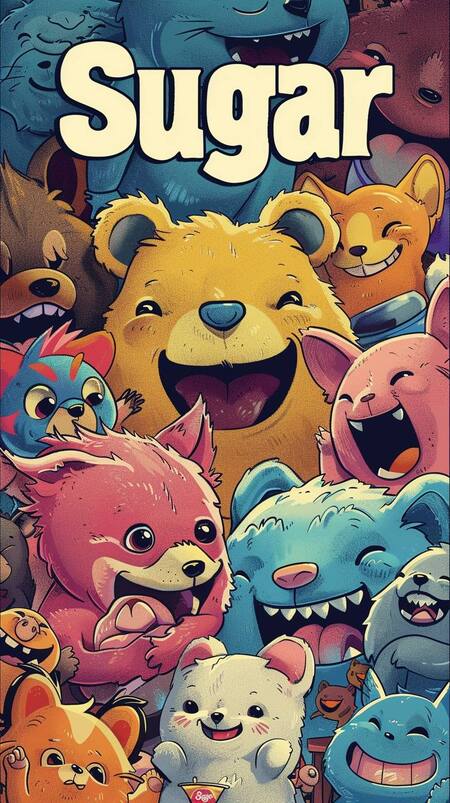 poster for a holiday agency with the image of happy animals, in a comic book style, with the word «Sugar» --aspect 9:16 --v 6.0 --style raw