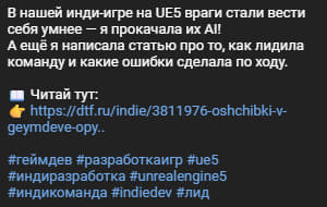 На данный момент dtf самая удобная площадка для продвижения себя в геймдев индустрии. Люди любят читать про чужой опыт и чужие ошибки, если им это может пригодиться, поэтому лучше чётко формулировать кому будет полезна статья в самом заголовке. Например, моя статья будет полезна лидам инди-команд.