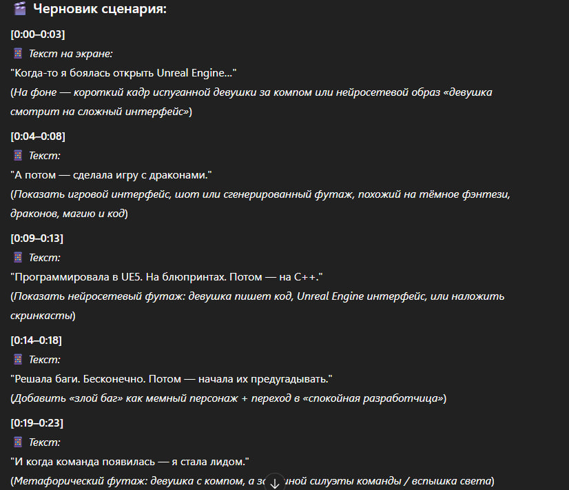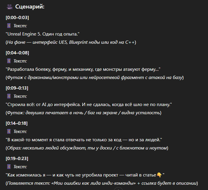 Промпты: 1. «Слишком серьёзный видос получается. У нас игра забавная, и видос должен быть забавным» 2. «В ролике реклама статьи не нужна. В ролике говорю только про код. Давай лучше ты выступишь в роли интервьюера, спросишь меня чего такого в коде я делала и на основе этого придумаешь сценарий»