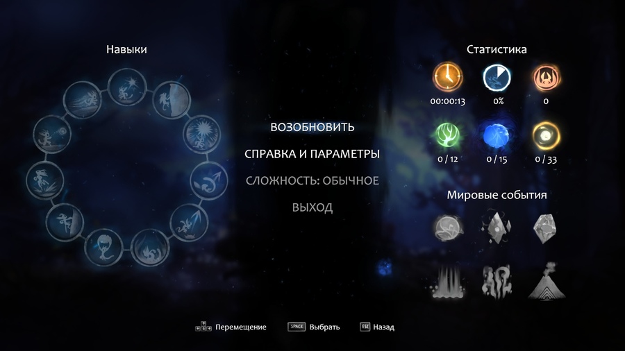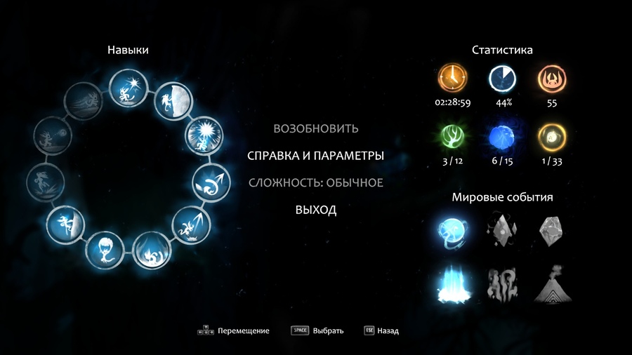 Меню, в котором виден прогресс прохождения игры. «Ori and The Blind Forest»