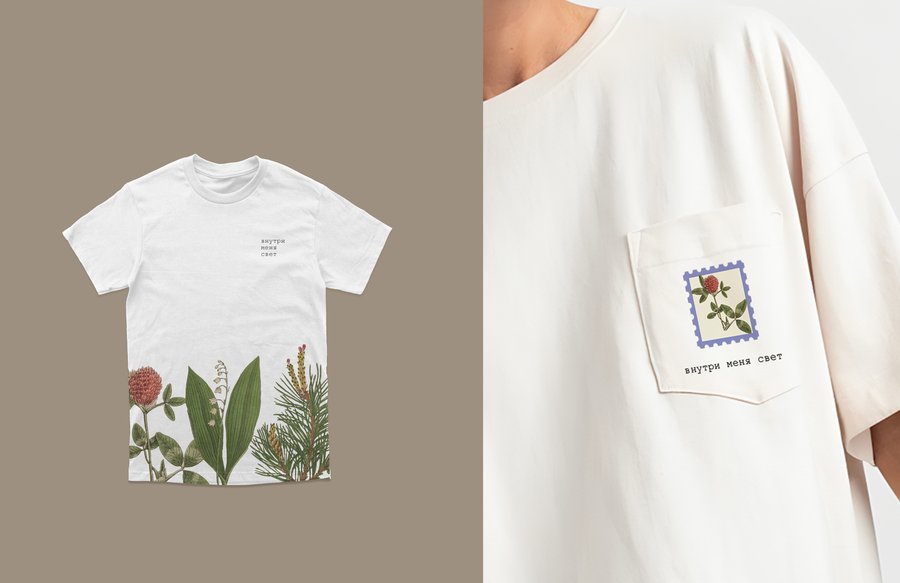 Image promt: Subject photography in a photo studio. A t-shirt by the candle brand called SVETMEST. The design is minimalistic and based on picture of 3D render of flowers and herbs and linear postage stamps. The design is made in the company colors: #DFE9F2, #9FA2A6, #A69958, #F2B705, #D97B59