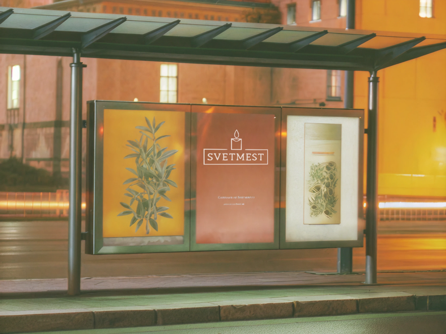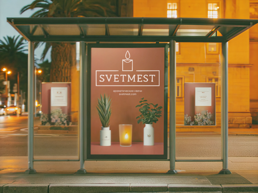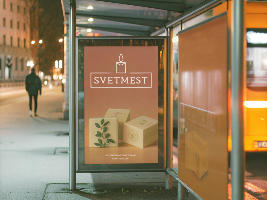Image promt: An advertising poster of a premium brand of candles called SVETMEST. The boxes are made in a minimalistic style and are based on botanical illustrations and linear postage stamps. The poster is located at the bus stop in the city. Photo on a professional camera, it’s evening in the picture