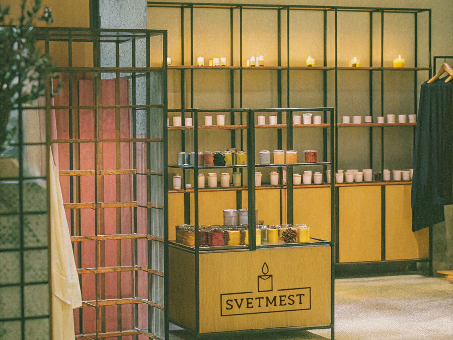 Image promt: interior photography. The trading platform of the svetmest brand of candles. The design is made in the company colors: #DFE9F2, #9FA2A6, #A69958, #F2B705, #D97B59