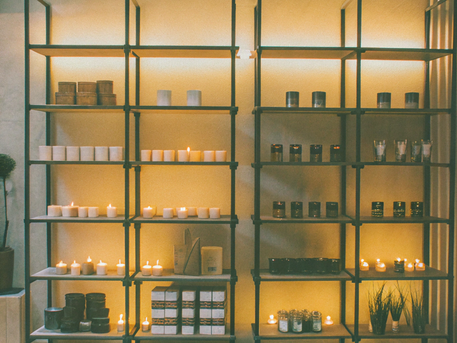 Image promt: Interior photography. An exhibition showcase of the brand’s scented candles, located in a premium home goods store. The design is made in the company colors: #DFE9F2, #9FA2A6, #A69958, #F2B705, #D97B59