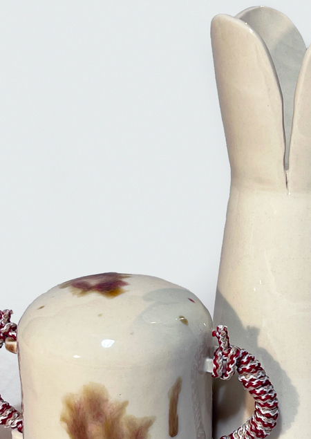 Продуктом рефлексии стала фарфоровая лампа с ручками из технологичного жгута, повторяющего форму ручек кувшинов, декоративные элементы верхней части вдохновлены формой листьев и лепестков орнамента кружевных салфеток, а основание будто забрызгано гранатовым соком, который со временем выцвел на солнце.