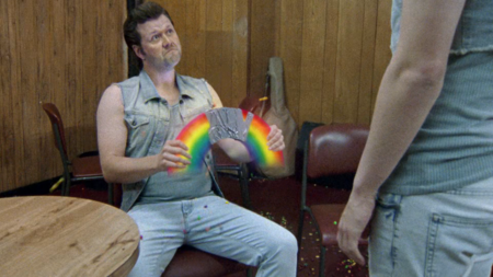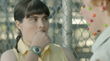 Героиня трижды отрывает Скиттлс из бровей девушки, при этом последняя никак этому не противится.
