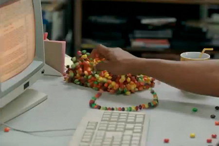 Главный столп рекламы Skittles — как ни странно, сами конфеты Skittles. В каждом ролике именно конфеты фигурируют как основной двигатель абсурдного сюжета.