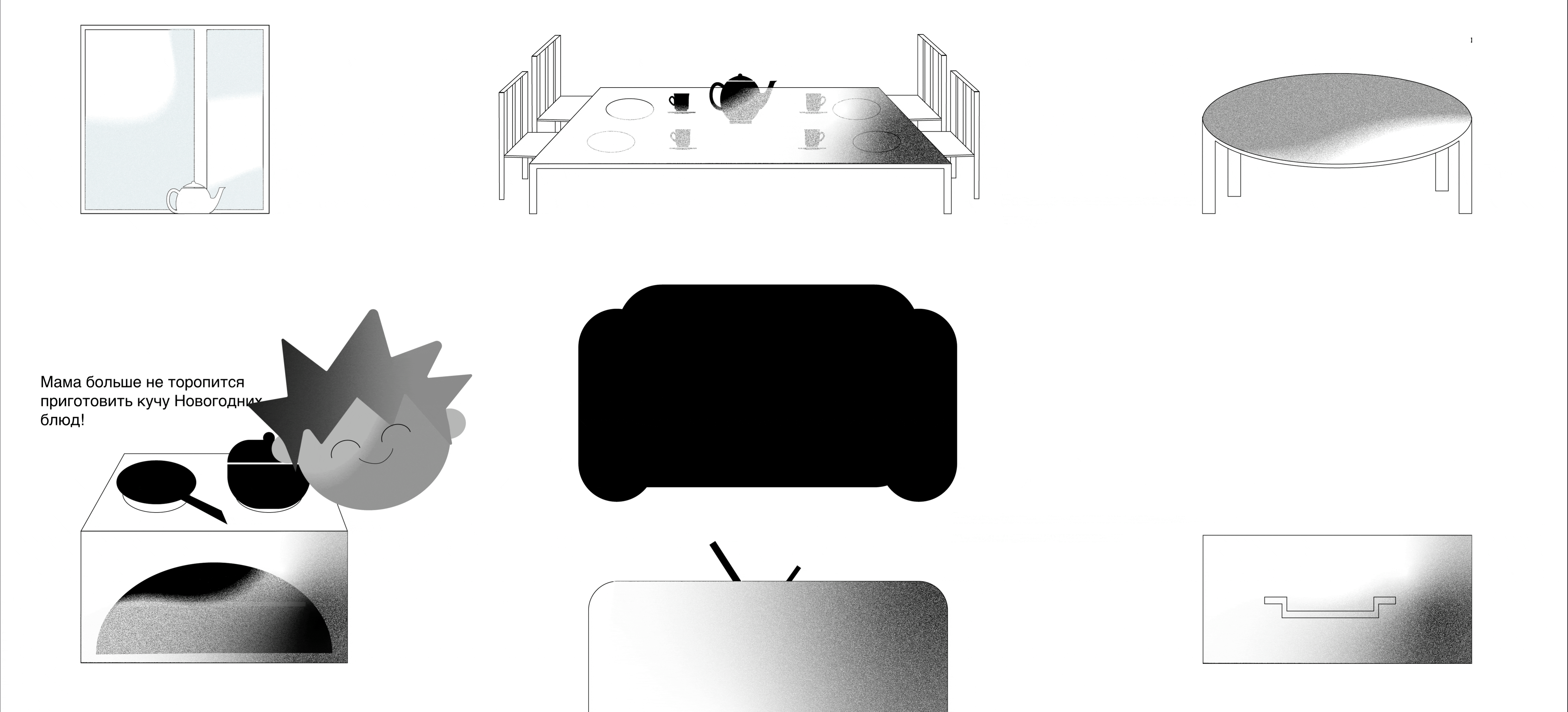 Книга состоит из двух частей: первая часть насыщена цветами, деталями, олицетворяя яркость и хаос Нового года.