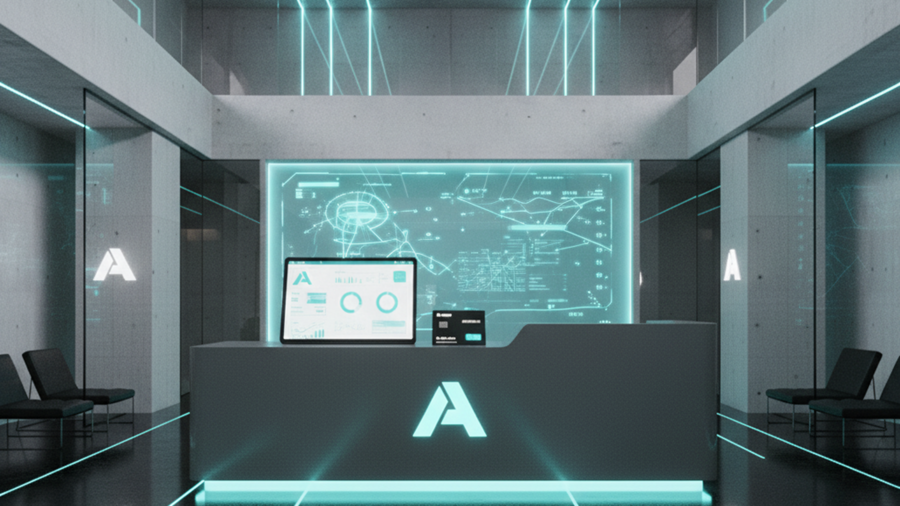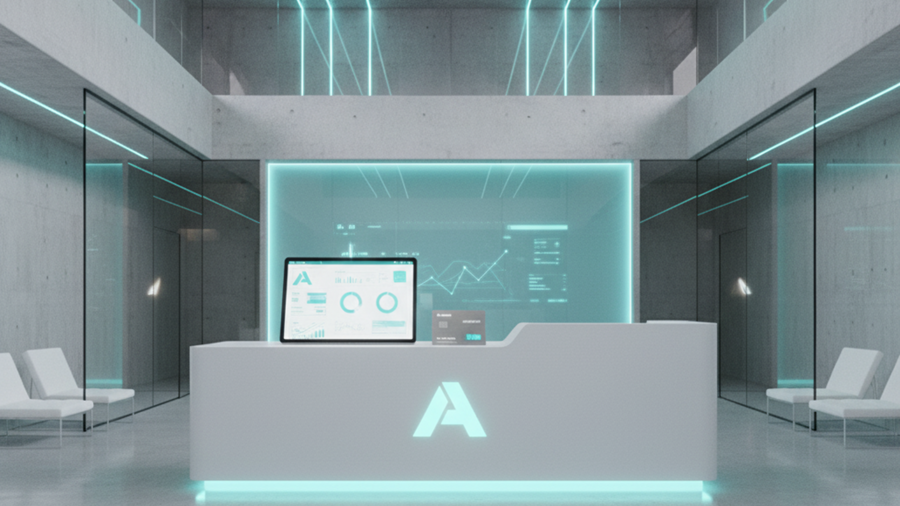 Create a realistic image of a modern office designed for the A-list brand. The space has light concrete walls, glass panels, and soft turquoise lighting lines along the ceiling and floor. In the center is a metal reception desk with the A-list logo glowing from below. The mood is clean, quiet, and futuristic.