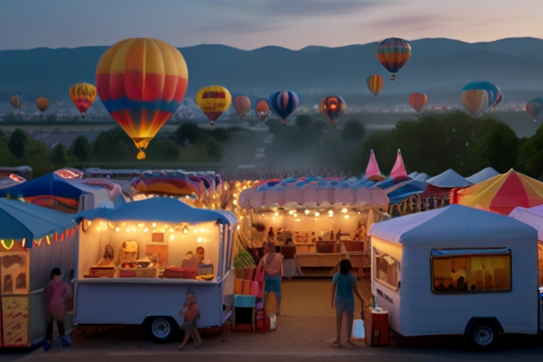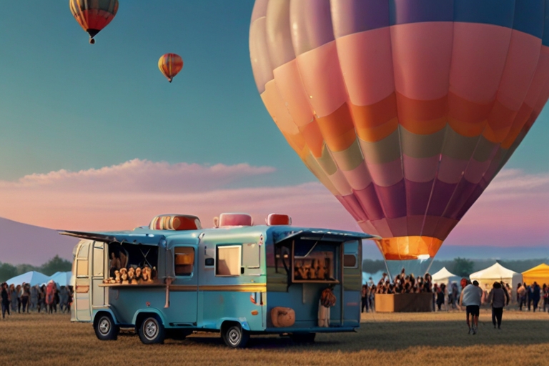 what does the character who walks through the territory of the balloon festival see, food trucks, tents, with sky-pastel colors — version 6.0