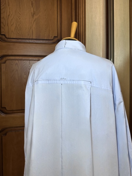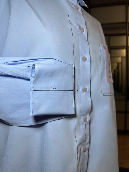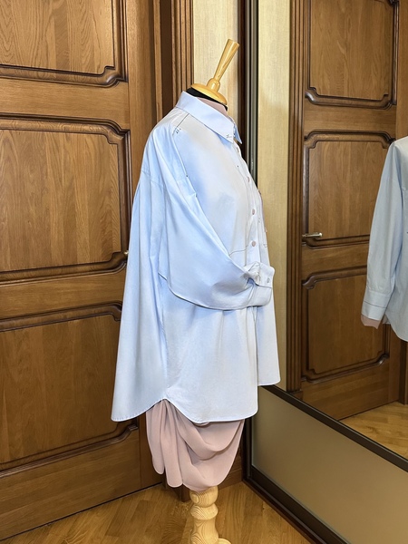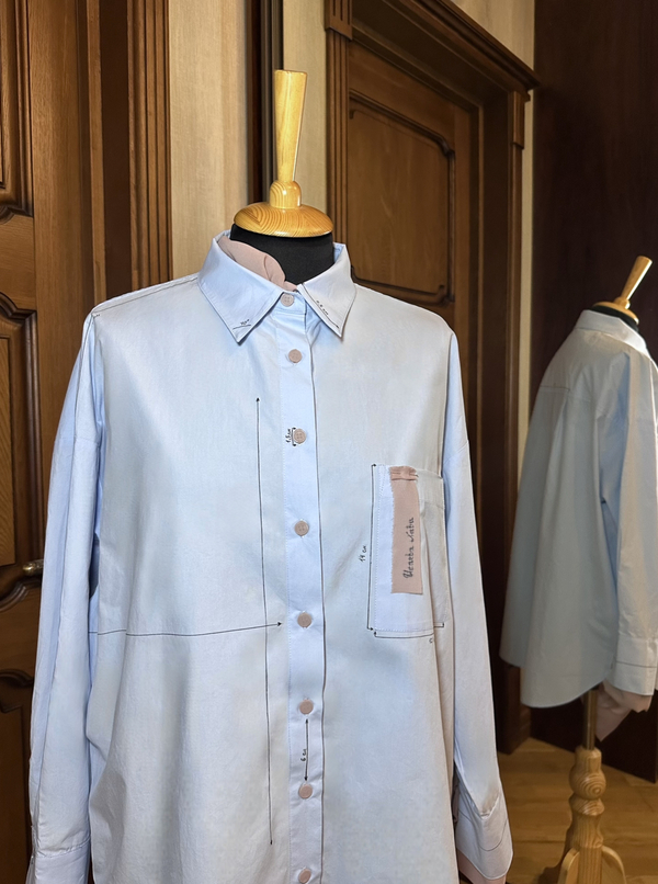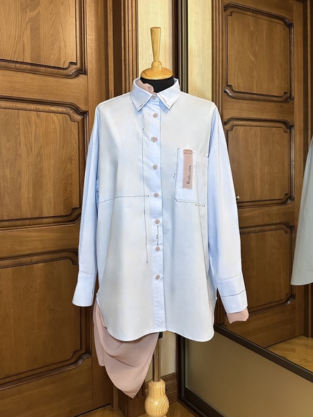 В результате проделанной работы по подбору картинок-ассоциаций были выявлены ключевые слова: структура, характер, строгость снаружи и мягкость внутри. Учитывая все ассоциации, было решено взять за основу голубую объемную рубашку. Для отображения структурированности личности на рубашку были нанесены четкие направляющие с пометками сантиметров. А для того, чтобы показать внутреннюю мягкость, было решено пришить легкую шифоновую ткань, которая виднеется по низу изделия и на пуговицах. Рубашка выполнена достаточно минималистично, что также отражает личность.
