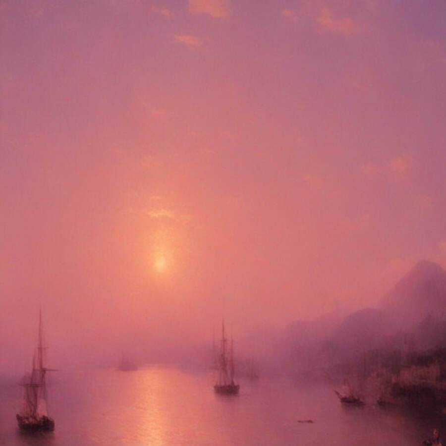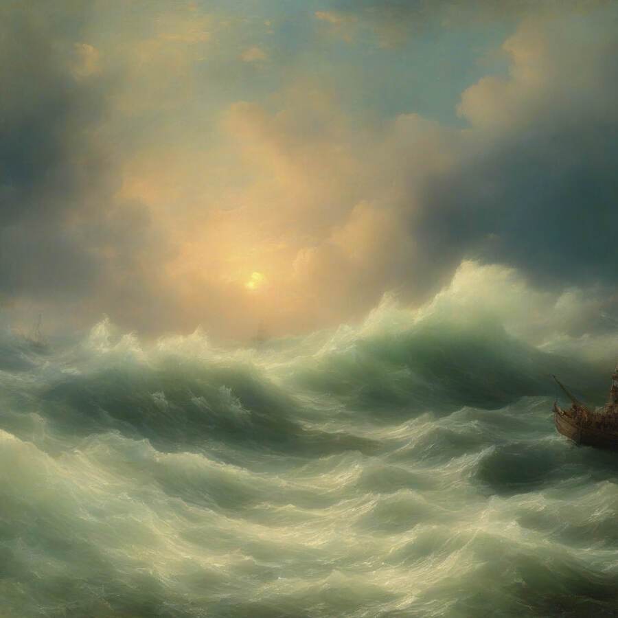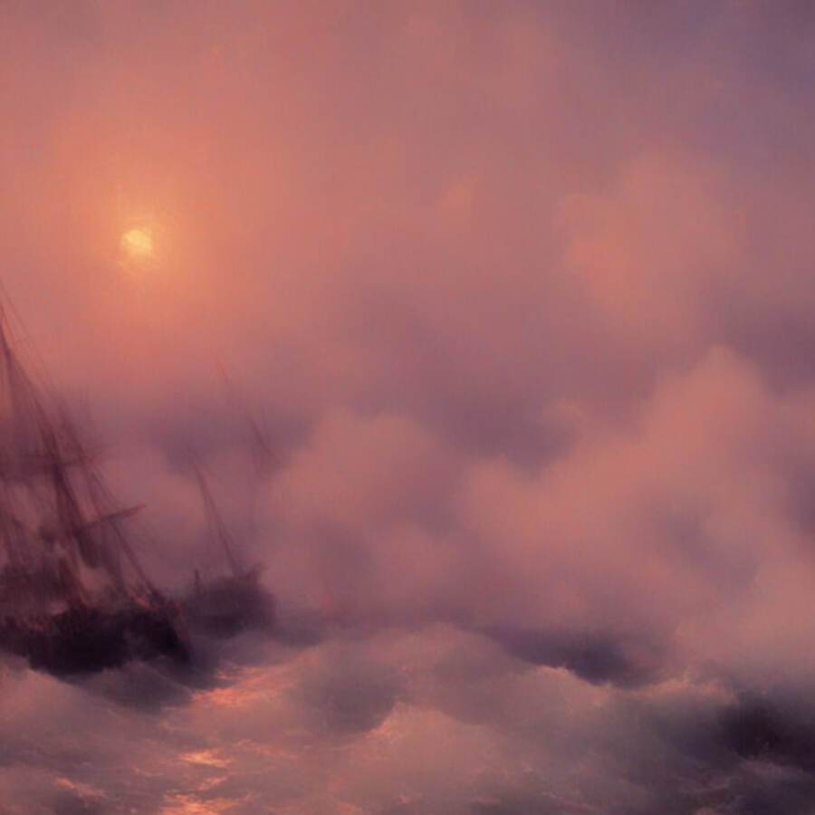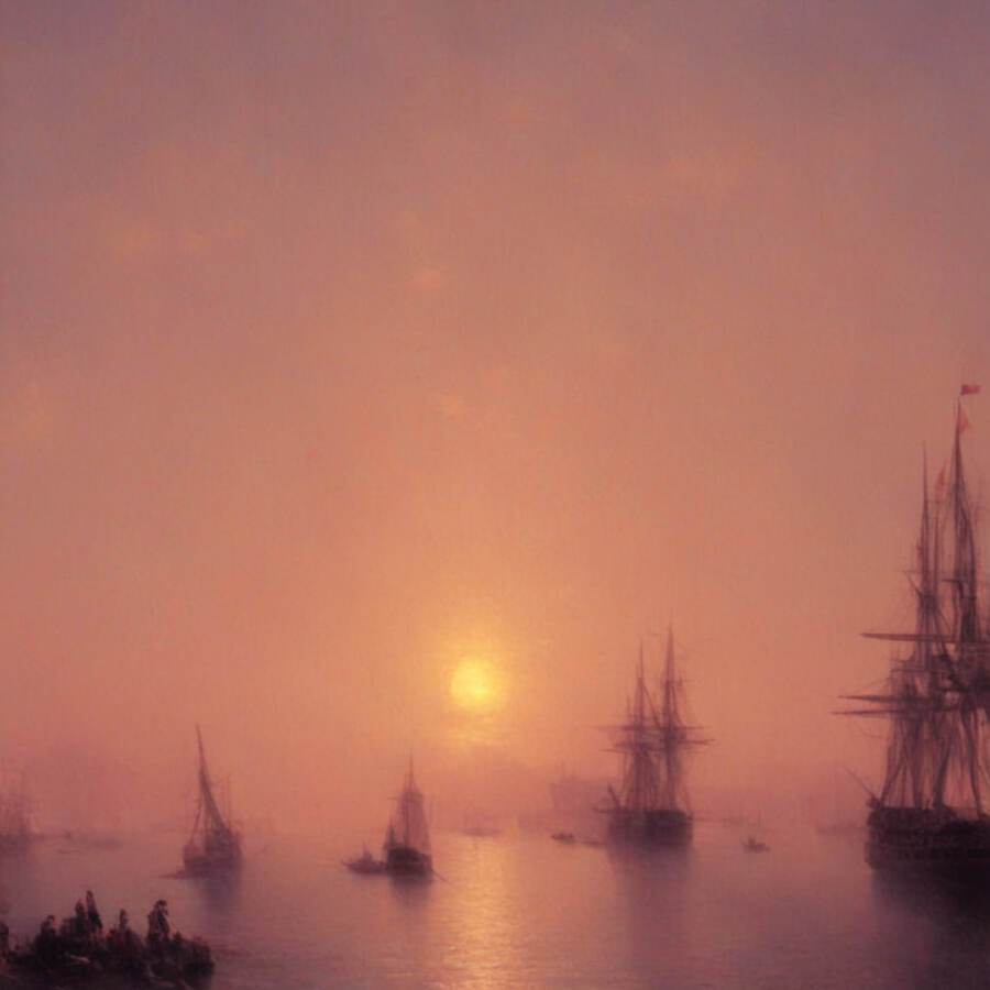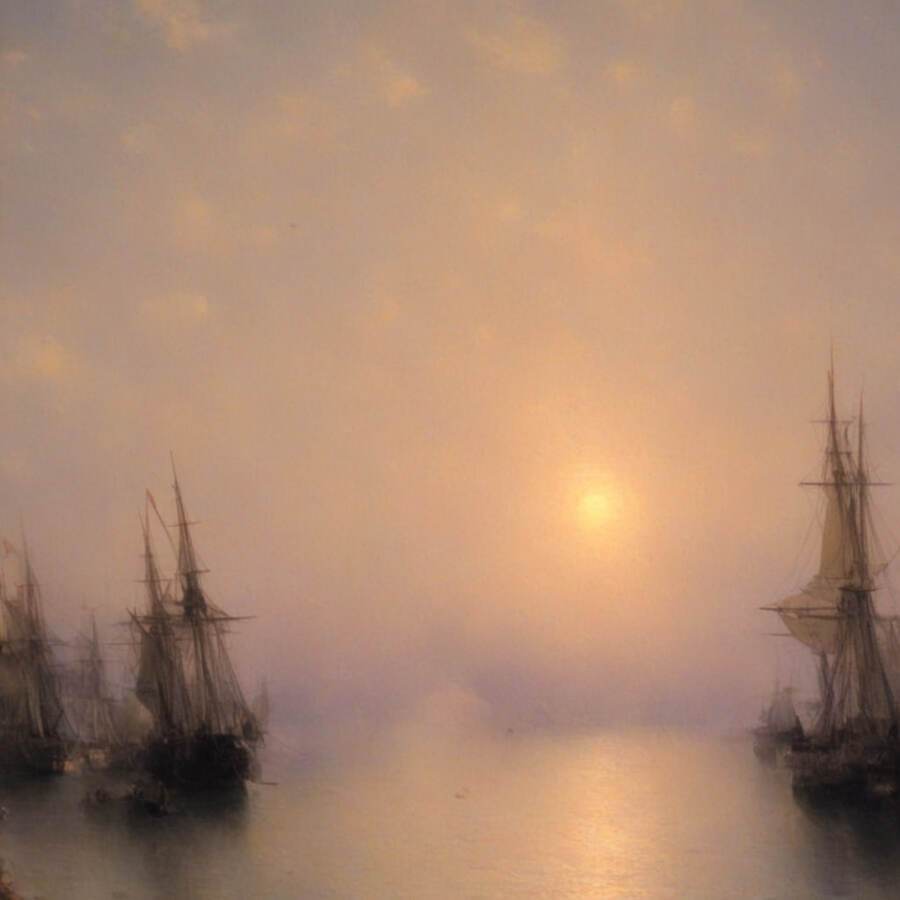 Нейросеть сумела уловить характерные для художника элементы — драматизм моря, игру света и тени, насыщенные цвета заката, динамичные композиции.