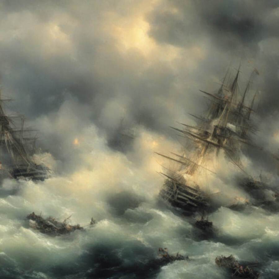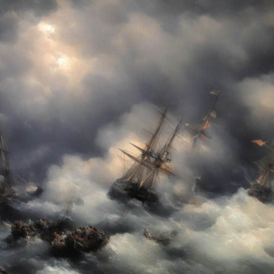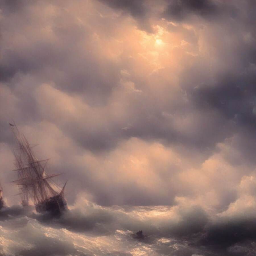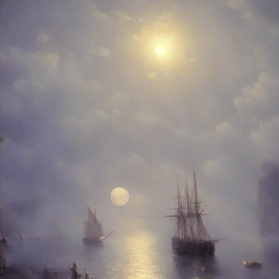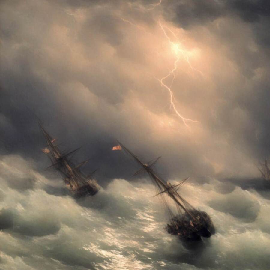 Изображения варьируются от спокойных прибрежных закатов до бурных сцен морских сражений. Нейросеть передала не только мощь стихии, но и её изменчивость — от умиротворенной красоты до эпической динамики столкновения кораблей и штормов.