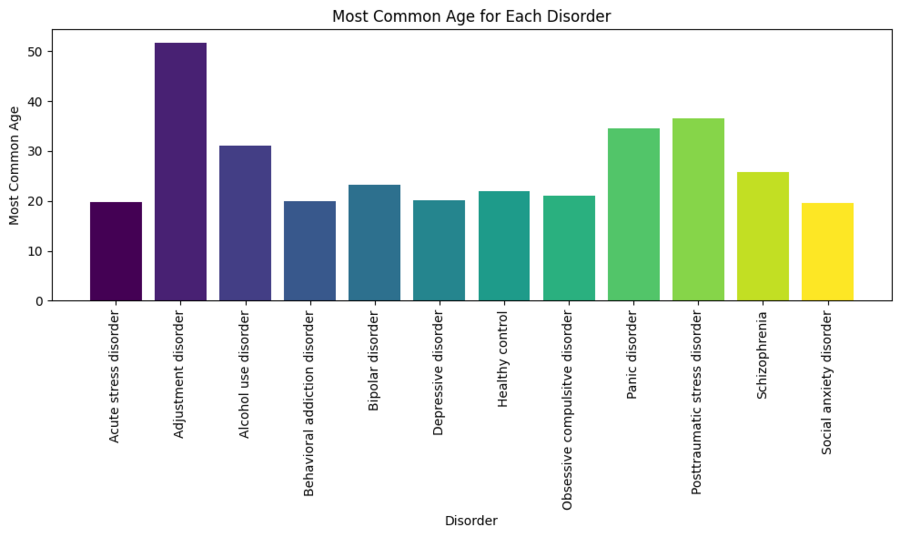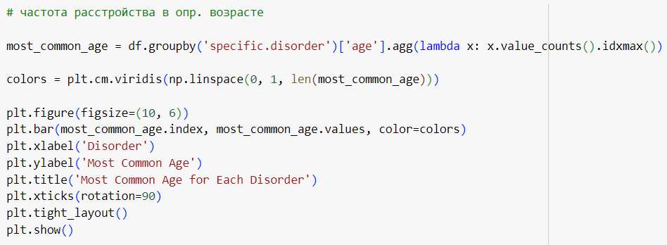 Я решила посмотреть, какой возраст наиболее часто встречается совместно с каждым диагнозом. Для этого я сгруппировала данные по расстройству и отфильтровала по соответствующему возрасту, после чего построила столбчатую диаграмму, где каждый столбец показывает расстройство, его высота — наиболее частый возраст, а цвет уникален для каждого столбца.