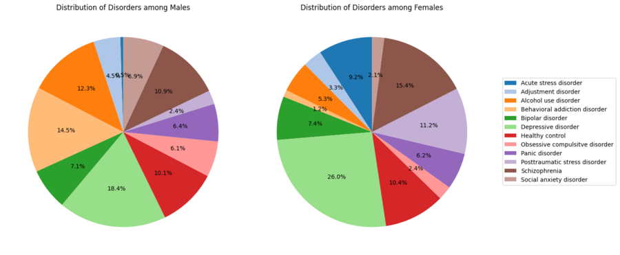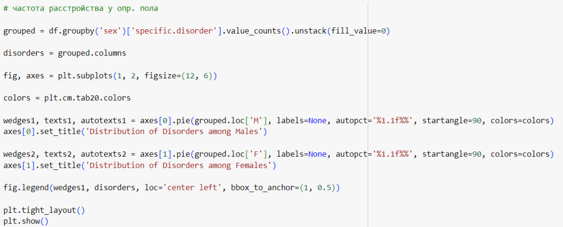 Я решила выяснить распространение расстройств среди мужчин и женщин, для чего выбрала круговые диаграммы как подходящий тип графика. Сначала я сгруппировала данные по полу, выделила в данных диагнозы и разбила их на две диаграммы с общей легендой. Каждый цвет на диаграмме отвечает за своё расстройство, что позволяет наглядно показать разницу диаграмм.
