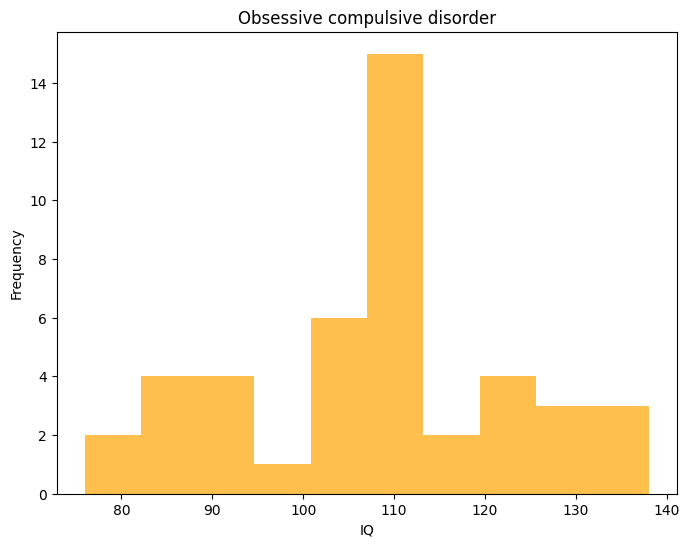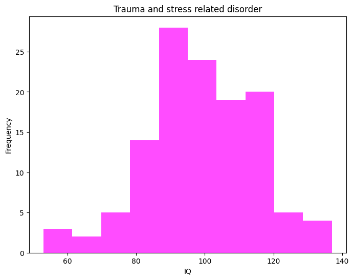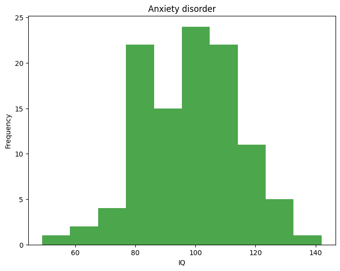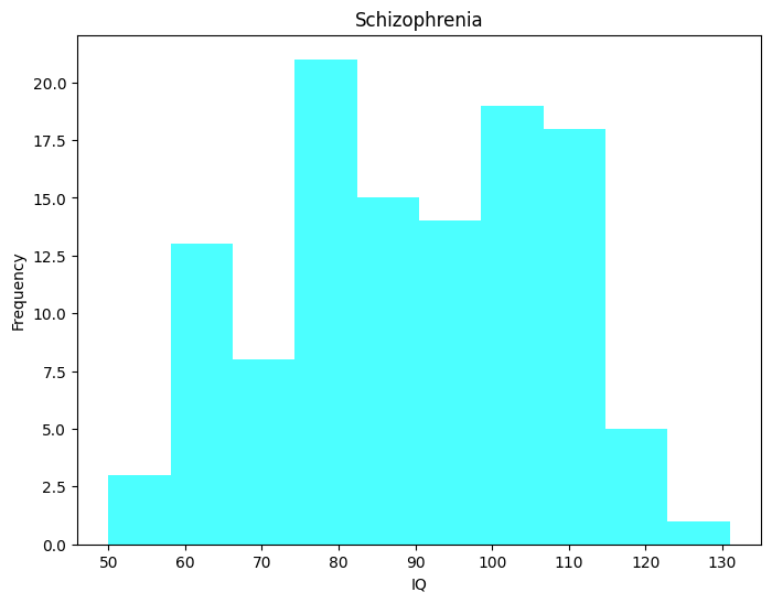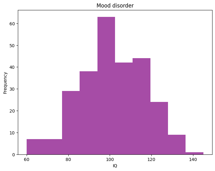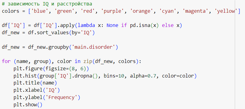 Мне стало интересно, какой уровень IQ наиболее часто наблюдается у людей с тем или иным психическим расстройством. Для этого я отсортировала данные по возрастанию показателя IQ, далее сгруппировала их по типу расстройства и построила индивидуальные гистограммы разного цвета для каждого.