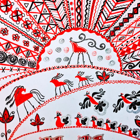 Для датасета, на котором будет обучаться нейросеть, я собрала 50 изображений мезенской росписи. Все изображения я привела к единому формату — 512*512. К тому же я дополнительно обрабатывала изображения, чтобы все были в примерно одной и той же цветовой гамме и модель не брала за референс картины, сфотографированные при плохом освещении.