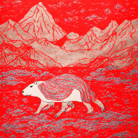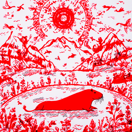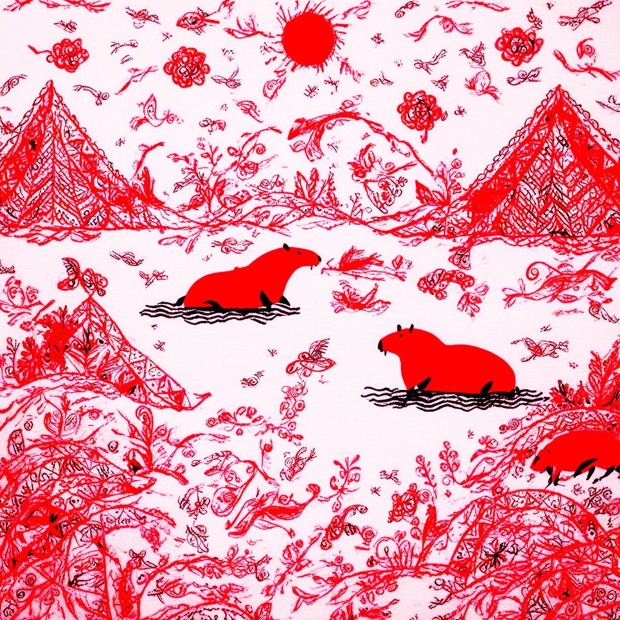 Ниже предоставлены картинки по промпту «art in MEZEN style, a large capybara is swimming in a lake, mountains on the background».