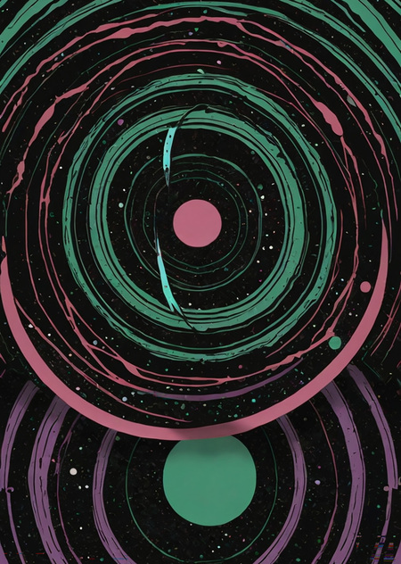 Create a shopper bag design with a cosmic print for the vinyl record store «Orbita». The design should include: - A pattern of planets with rings in different colors: purple (#B537FA), green (#04D010)