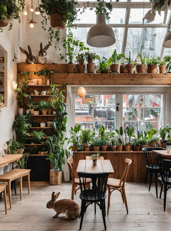 Выбор пространства был сложен, учитывая, что у меня видеоигра, действия которой проходят на северных холмах, где есть лишь озера, трава и цветы. Остановилась на кафе, а точнее кафе с кроликами, так как моя игра как раз про кроликов.