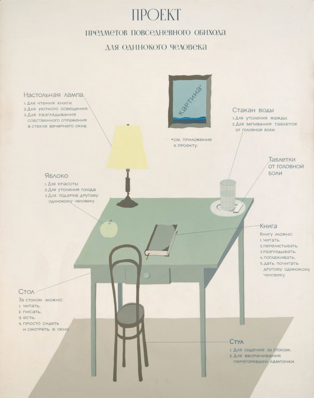 Обыкновенные бытовые объекты, вроде кухонной утвари, также вызывали интерес у московских концептуалистов. Например, серия Кабакова 1960-80-х годов посвящена привычному для каждого жильца коммунальной квартиры вопросу о том, кому принадлежит та или иная вещь на общей кухне. Тёрка, кружка или ковшик располагаются на полотне и сопровождаются текстом-диалогом между людьми: «Чье это?». Повседневная жизнь советского человека и его быт в проектах Кабакова становятся полноценными произведениями искусства.