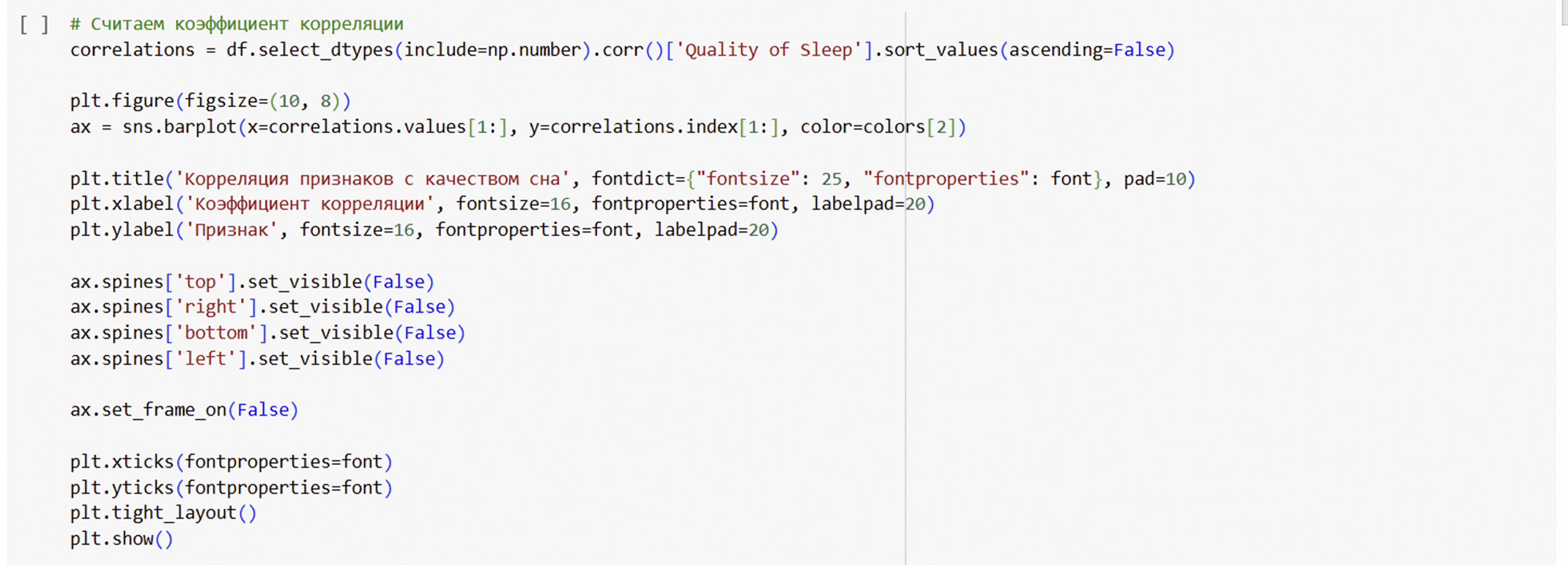 Для визуализации данных я выбрала гистограмму (используется для отображения распределения качества сна), скрипичный график (применяется для анализа зависимости качества сна от уровня стресса), столбчатую диаграмму (подходит для визуализации средних значений признаков по категориям), график корреляции признаков с качеством сна (позволяет наглядно определить, какие переменные наиболее сильно связаны с качеством сна).
