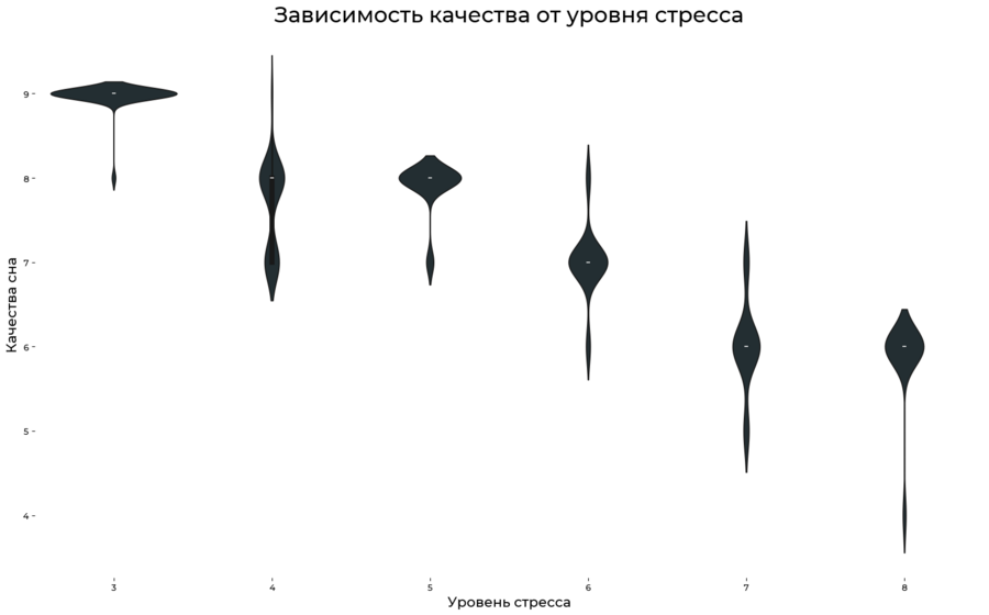 Обратив внимание на уровень стресса 3, можно заметить, что «скрипка» в этом месте довольно широкая — это говорит о том, что большое число людей с таким уровнем стресса имеют высокое качество сна. Аналогично, у участников с уровнем стресса ниже 5 наблюдается хорошее качество сна — выше 7 баллов. В то же время график показывает, что с увеличением стресса качество сна снижается, что подтверждает негативное влияние стресса на сон.