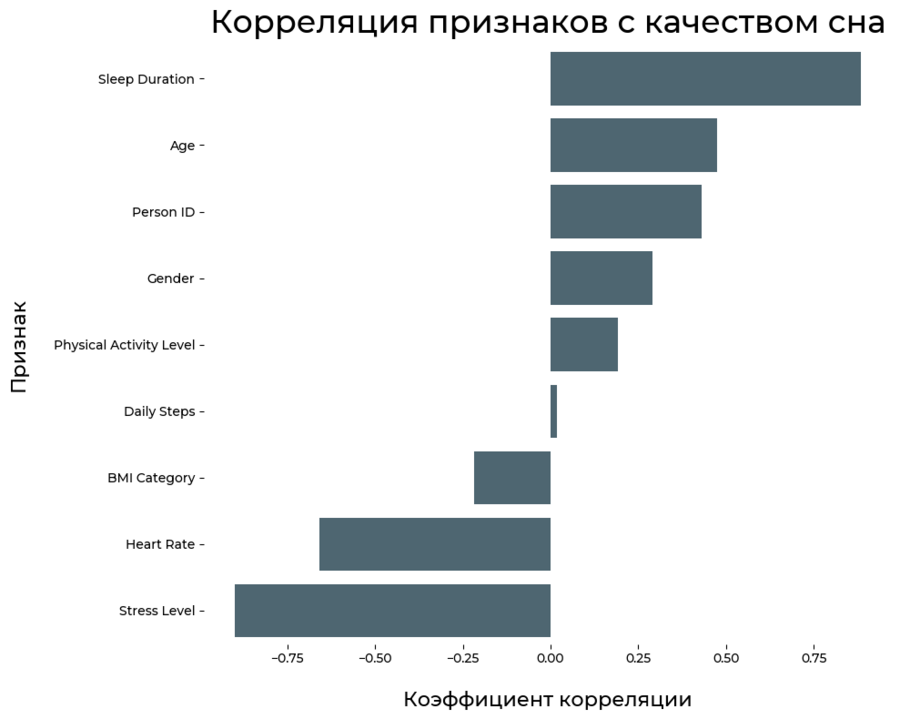 Цель исследования — выявить, какие характеристики наиболее сильно коррелируют с субъективной оценкой сна, и определить, какие из них можно рассматривать как ключевые предикторы высокого или низкого качества сна.